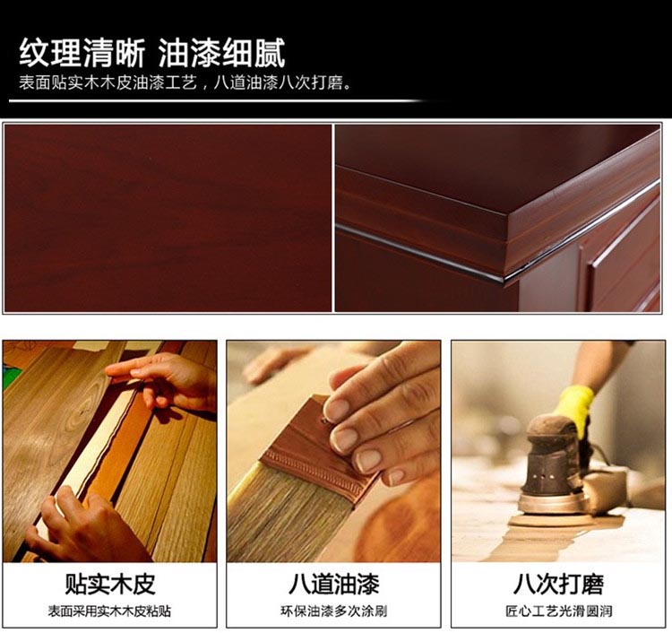 【飾面】:飾面選用進(jìn)口一級(jí)胡桃木木皮,經(jīng)過(guò)防蟲(chóng)防腐處理,五底三面進(jìn)口油漆,耐磨性好,紋理清晰自然,色澤一致
